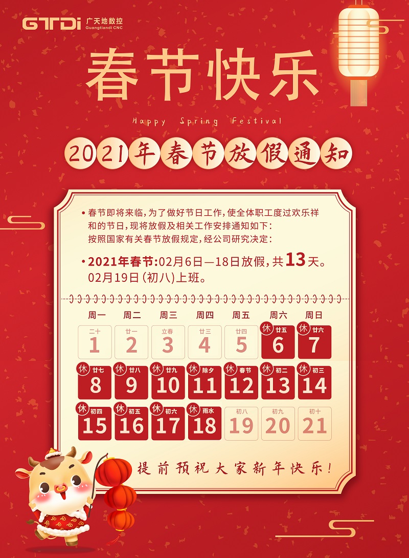 2021年春節(jié)將至,首先感謝您在2020年里的鼎力支持和愉快合作,廣天地數(shù)控全體同仁在此給您拜個早年。在新年的一年里,我們將更加努力,為您提供更優(yōu)質(zhì)的服務(wù)。按照國家春節(jié)放假規(guī)定結(jié)合我司的具體情況,春節(jié)放假時間安排如下: