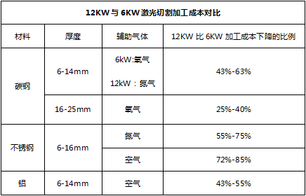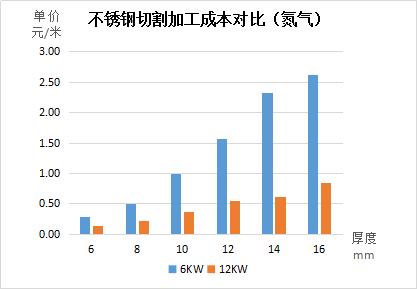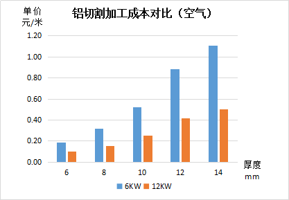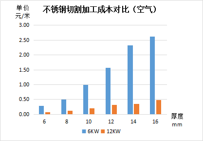 從以上數(shù)據(jù)可見:對比6KW激光加工成本,12kW激光切割成本基本都可以保持降低一半以上,其中不銹鋼優(yōu)勢最大,其次是碳鋼、鋁。切割不銹鋼時使用空氣作為輔助氣體,單價加工成本最 低,可以滿足對切割端面要求不高的產(chǎn)品。