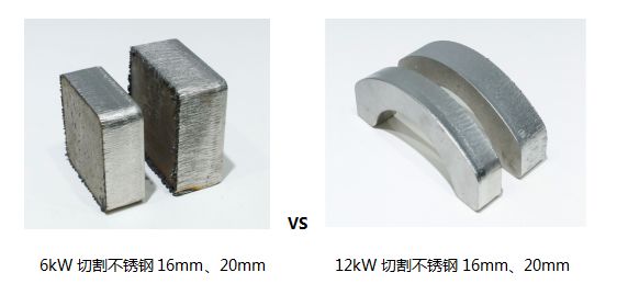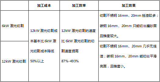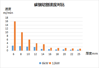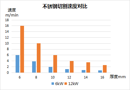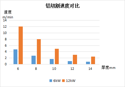 從測試的切割速度得出: 切割碳鋼時,12kW激光切割的速度比6kW激光切割的切割速度快87%—493%;切割不銹鋼時,12kW激光切割的速度比6kW激光切割的切割速度快163%—289%;切割鋁時,12kW激光切割的速度比6kW激光切割的切割速度快150%-213%。